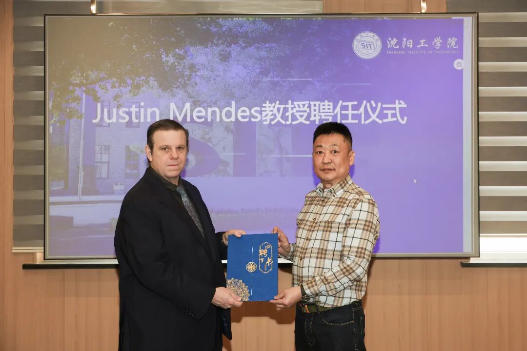 Recently, the People's Government of Liaoning Province announced the list of recipients of the 2025 "Liaoning Friendship Award." Dr. Justin Mendes, a specially appointed foreign expert at our university, was selected for his outstanding contributions in the areas of digitally intelligent talent development, industry-education integration, and internationalized education. On March 24th, the Liaoning Friendship Award presentation ceremony was held at our university. Peng Zhiping, Director of the Foreign Expert Affairs Division of the Provincial Department of Human Resources and Social Security, attended the event and presented the award to Justin. University Chairman Wang Zhaobao presented Justin with a Lifetime Professorship appointment letter from Shenyang Institute of Technology, and Vice President Xu Ying also attended.